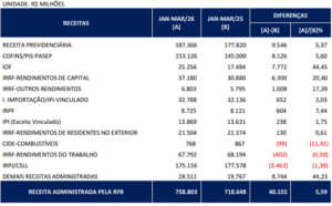 Quanto às Receitas Administradas pela RFB, o valor arrecadado, em março de 2026, foi de R$ 223.531 milhões, representando um acréscimo real (IPCA) de 5,56%, enquanto no período acumulado de janeiro a março de 2026, a arrecadação alcançou R$ 751.942 milhões, registrando acréscimo real (IPCA) de 5,59%. O acréscimo observado no período pode ser explicado, principalmente, pelo crescimento da arrecadação da contribuição previdenciária e pelos desempenhos das arrecadações do PIS/Cofins, do IRRF-Capital e do IOF.